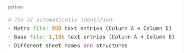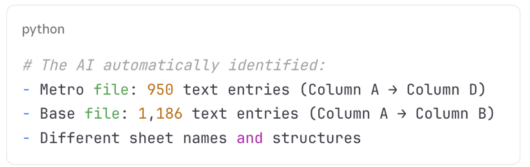 Key insight: The AI didn't just read the data—it understood the mapping between different column structures across files.