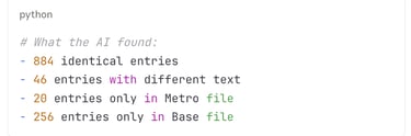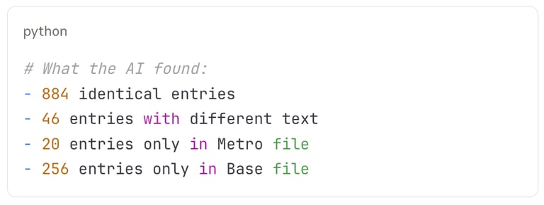 The magic: Every single text string was compared programmatically. Zero manual errors, 100% coverage.